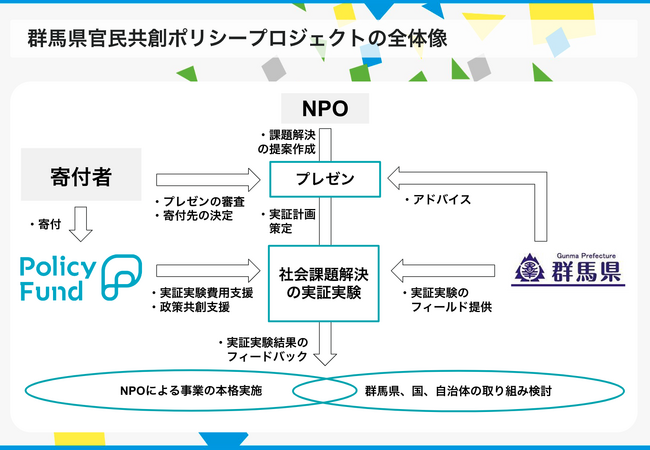 政策を軸にした、社会課題解決を加速するための寄付基金「Policy Fund」等を運営する株式会社PoliPoli(所在地:東京都千代田区、代表取締役:伊藤和真)は、群馬県と連携し、「Policy Fund」から寄付を受けた非営利団体等が群馬県で社会課題解決の実証実験を行う「群馬県官民共創ポリシープロジェクト(以下、本プロジェクト)」を開始することをお知らせします。