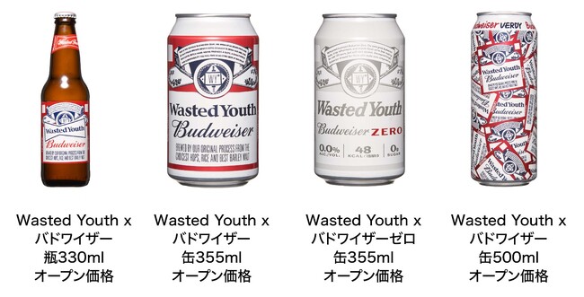 VERDYが手掛けるアートプロジェクト「Wasted Youth(ウェイステッド ユース)」とBudweiserがコラボし、数量限定で4ラインナップのデザインを展開します。昨年も限定デザインを発表した、350mlの缶と瓶は、品格と繊細さはそのままに、よりシンプルに「Wasted Youth」と「Budweiser」のロゴを引き立たせました。また、500ml缶とBudweiser ZEROにおいては、今回初のコラボ商品となります。