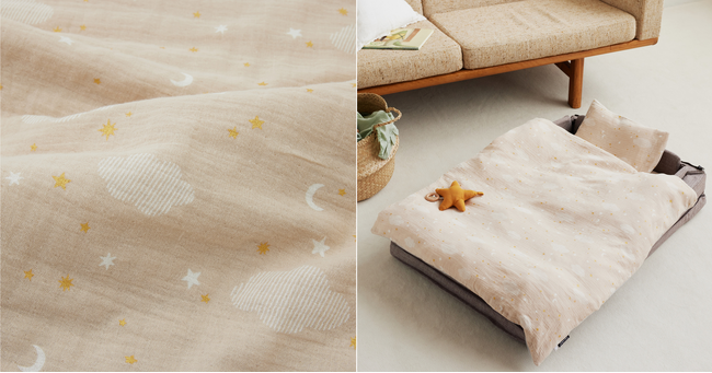 第1弾ではカラーやガーゼの風合いから軽やかな印象でしたが、今回は秋冬生まれの赤ちゃんも使いやすい温もりあるデザインと風合いが魅力。ふとんカバー、まくらカバーに使用した“ドリーミングスター”のテキスタイルはベージュが基調。ガーゼとやわらかなコットンフランネルのリバーシブルで、オールシーズンお使いいただけます。また、テキスタイルに合わせてベッドのカラーをメランジブラウンに。ナチュラルテイストのインテリアに調和します。