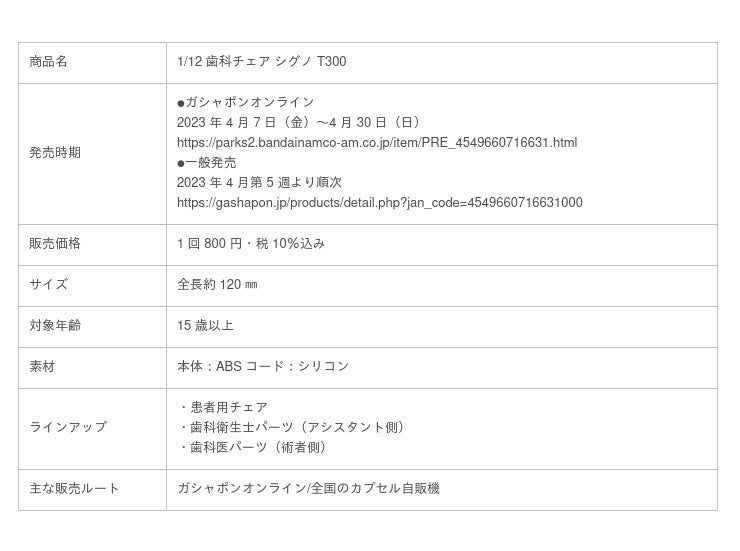 株式会社バンダイ ベンダー事業部(本社:東京都台東区)は株式会社モリタ(本社:大阪府吹田市)が販売する 歯科チェア「シグノ T300」を 12 分の 1 のサイズで再現したリアルフィギュア『1/12 歯科チェア シグノ T300』(1 回 800 円・税 10%込)を 2023 年 4 月 7 日(金)よりオンラインショッピングサイト「ガシャポンオンライン」にて、4 月第 5 週より順次、全国のカプセルトイ自販機にて販売いたします。