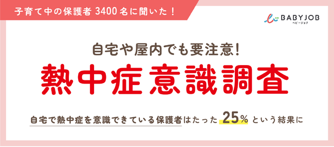 保育施設向けおむつのサブスク「手ぶら登園」や保育施設探しをサポートする「えんさがそっ♪」など、子育て支援サービスを運営するBABY JOB株式会社は、0~5歳の子どもを育てる全国の保護者3,400名を対象に子どもの熱中症対策に関するアンケート調査を行いました。