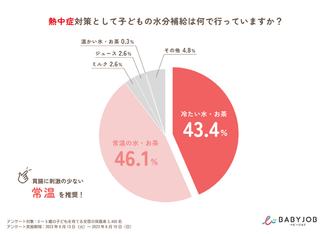 また、一般的に子どもの水分補給は、胃腸に負担のかかる冷たい水やお茶ではなく常温の水やお茶が好ましいとされています。しかし、BABY JOBが行った調査の結果では、43.4%の保護者が「冷たい水・お茶」で子どもの水分補給をしていると回答しました。