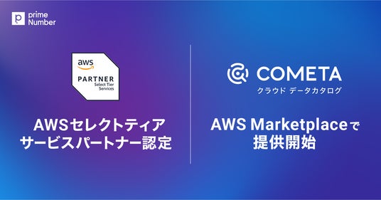 株式会社primeNumber(本社:東京都品川区、代表取締役CEO 田邊 雄樹)はアマゾン ウェブ サービス(AWS)が提供するAWS パートナーネットワーク(APN)において、「AWS セレクトティアサービスパートナー」に認定されました。また、クラウド データカタログ「COMETA」をAWS Marketplace上で提供開始しました。