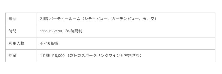 また、ご友人やご家族と久しぶりに再会する4名様以上のお集まりには、21階の個室にてこのワンプレートディナーを味わう「クリスマスパーティープラン」がおすすめ。オプションメニューとしてご用意したDIYケーキ “プレザント” を予約すれば、いつも以上にクリスマスが盛り上がること間違いなしです。