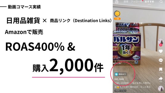 studio15では動画コマースにも既に力を入れており、日用品雑貨の販売で商品リンク(Destination Links)機能を活用し、累計400%のROASおよび、2000件を超える購入を達成しました。