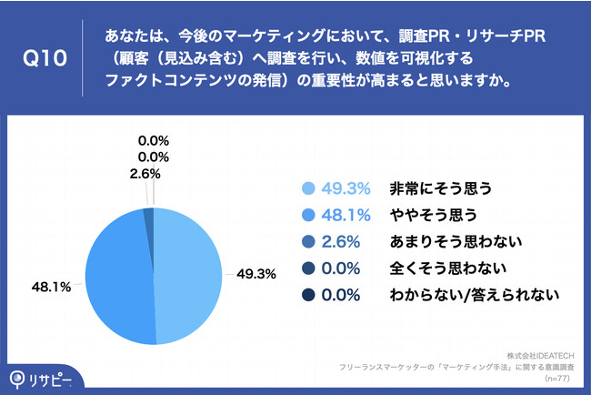 Q7で「非常にそう思う」「ややそう思う」と回答した方に、「Q10.あなたは、今後のマーケティングにおいて、調査PR・リサーチPR(顧客(見込み含む)へ調査を行い、数値を可視化するファクトコンテンツの発信)の重要性が高まると思いますか。」(n=77)と質問したところ、「非常にそう思う」が49.3%、「ややそう思う」が48.1%という回答となりました。