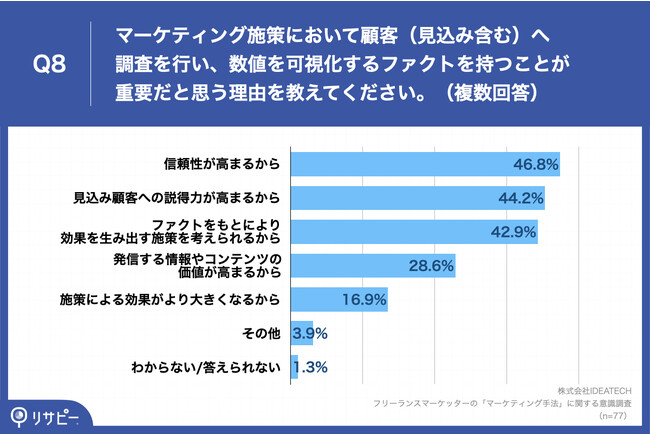 Q7で「非常にそう思う」「ややそう思う」と回答した方に、「Q8.マーケティング施策において顧客(見込み含む)へ調査を行い、数値を可視化するファクトを持つことが重要だと思う理由を教えてください。(複数回答)」(n=77)と質問したところ、「信頼性が高まるから」が46.8%、「見込み顧客への説得力が高まるから」が44.2%、「ファクトをもとにより効果を生み出す施策を考えられるから」が42.9%という回答となりました。