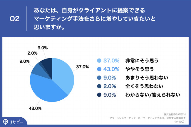「Q2.あなたは、自身がクライアントに提案できるマーケティング手法をさらに増やしていきたいと思いますか。」(n=100)と質問したところ、「非常にそう思う」が37.0%、「ややそう思う」が43.0%という回答となりました。