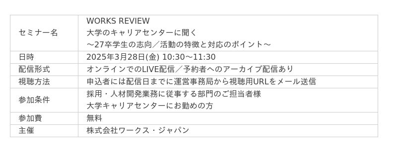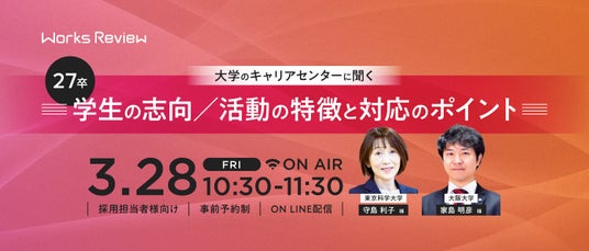 株式会社ワークス・ジャパン(本社:東京都千代田区、代表取締役:清水信一郎)は、2025年3月28日(金)に企業の人事担当者及び人材開発担当者を対象にしたオンラインフォーラム、WORKS REVIEW『大学のキャリアセンターに聞く~27卒学生の志向/活動の特徴と対応のポイント~』を開催します。