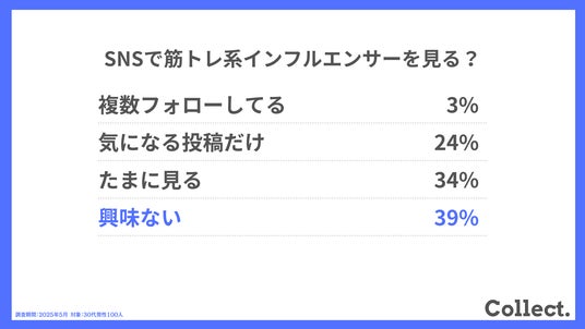 「たまに見る(34%)」「気になる投稿だけ見る(24%)」と、6割近くが筋トレ系インフルエンサーの発信を目にしている結果となりました。