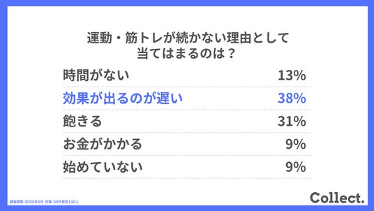 「効果が出るのが遅い(38%)」「飽きる(31%)」が上位に。変化の実感が薄いと継続する意欲が失われやすく、短期間で成果の見える運動習慣が求められているようです。