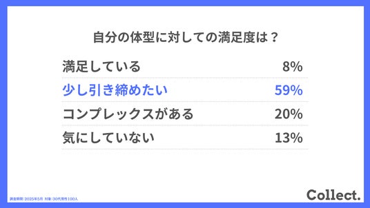 - 59%が「もう少し引き締めたい」と回答。体型管理への関心は30代でも根強い