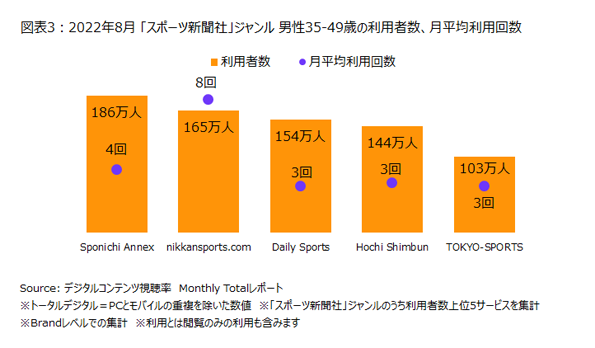最後に、TARPが最も高かった男性35-49歳の利用状況をサービス別に見ると、利用者数ではSponichi Annexが最も多く186万人で、nikkansports.comが165万人で続いていました。また、平均利用回数ではnikkansports.comが月平均8回で最も多く、Sponichi Annexが4回で続いていました(図表3)。