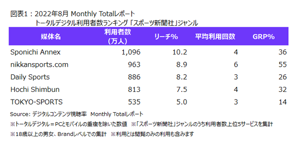 2022年8月のニールセン デジタルコンテンツ視聴率 Monthly Totalレポートによると、「スポーツ新聞社」ジャンルにおいて、PCとモバイルの重複を除いたトータルデジタルの利用者数が最も多かったのはSponichi Annexで1,096万人が利用しており、nikkansports.comが963万人で続いていました。また、平均利用回数では、nikkansports.comが月平均6回で最も多くなっていました(図表1)。