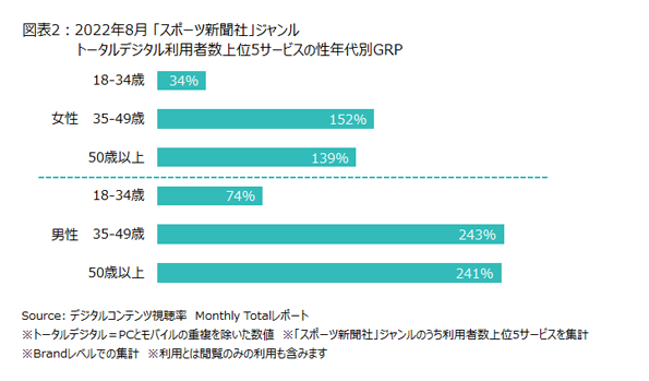 次に、「スポーツ新聞社」ジャンルにおける利用者数ランキング上位5サービスを合計したターゲットGRP(TARP)を性年代別に見ると、男性35-49歳で最も高く243%となっていました。次いで男性50歳以上で241%となっていました(図表2)。