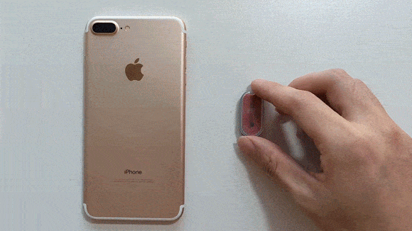 カバーの蓋を開けて、粘着性ゴムで顕微鏡レンズをスマホのカメラに貼ると、取り付けが完了します。