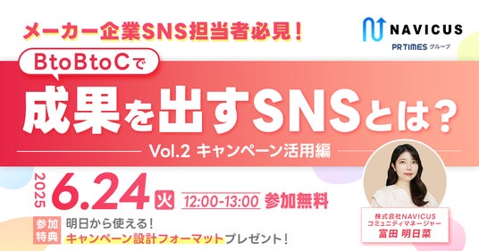 SNSを通じて企業様や地方自治体様のコミュニケーション支援サービスを提供する株式会社NAVICUS(本社:東京都千代田区、代表取締役:武内 一矢、以下:NAVICUS)は、メーカー企業のSNS・マーケティング・広報ご担当者様を対象にした無料ウェビナー「メーカー企業SNS担当者必見!BtoBtoCで成果を出すSNSとは?~Vol.2 キャンペーン活用編~」を、2025年6月24日(火)に開催いたします。
