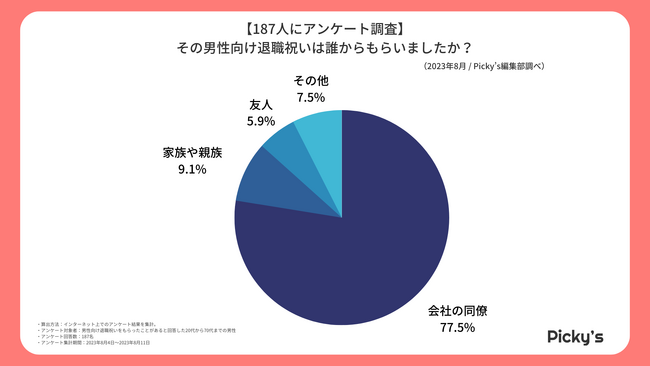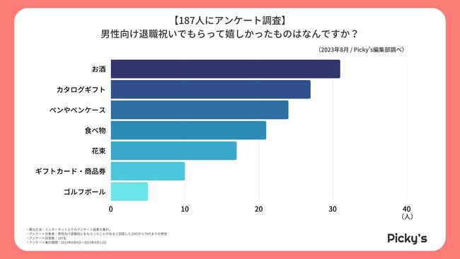 「Picky’s」は、インターネットショッピングにおいて、購入前に試せない・選ぶべきものがわからないという課題の解決を目標に、あらゆる商品のおすすめランキングや検証レビューを紹介するサイトです。このたびPicky’s(https://rentry.jp/note/)では、男性がどんな退職祝いをもらって嬉しかったのか、インターネット上でアンケート調査を行いましたので発表いたします。