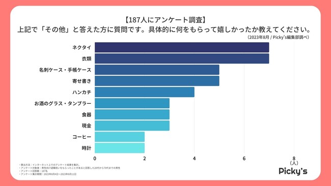 おすすめ比較サイト「Picky's」を運営する株式会社rentryがインターネット調査を実施し、男性が退職祝いで貰って嬉しかったものに関するアンケート結果を発表しました。