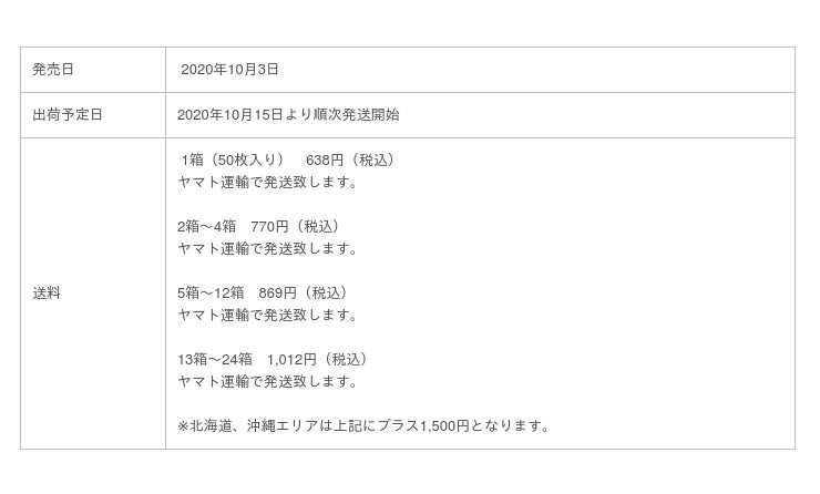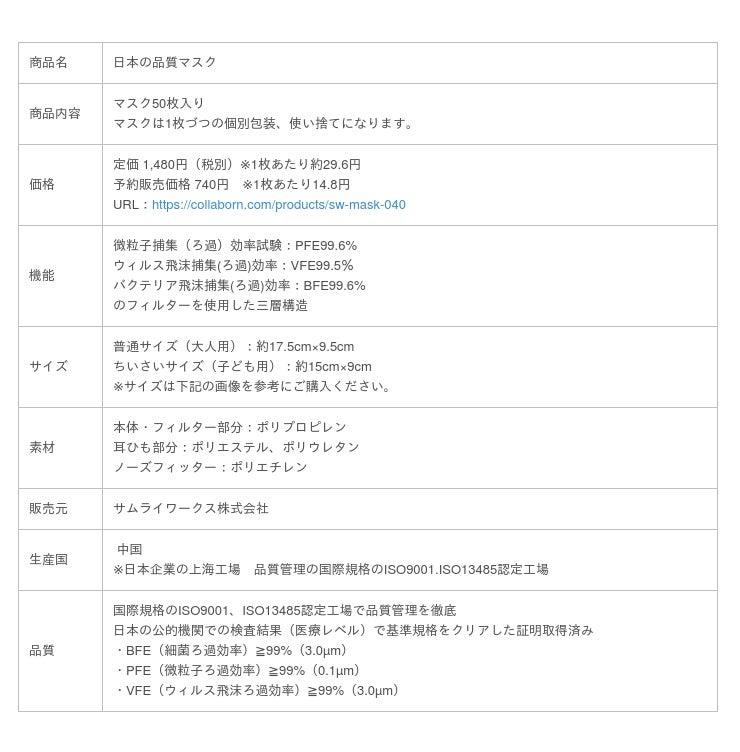 サムライワークス株式会社(代表取締役社長:新島 実 本社所在地:東京都渋谷区)は、メルトブローン不織布フィルター採用で医療用レベルの不織布マスク『日本の品質マスク』の第6弾の追加販売を開始します。『日本の品質マスク』は品質や環境問題に関しての国際規格ISO9001、ISO13485認定の工場で品質管理を徹底して製造されたマスクを、日本の検査機関でフィルター性能の検査を行い、その検査結果でPFE99.6%、BFE99.6%、VFE99.5%と基準規格を大幅に上回る結果の証明を取得した、正真正銘の安心・安全・高品質の不織布マスクです。本日追加販売を行う第6弾は9月28日に第5弾として30万枚の追加販売を開始しましたが約2日間で予定枚数の30万枚のご注文を頂き、本日急遽10月9日入荷分としてさらに30万枚の追加を行う事に致しました。今回の第6弾も予約特典として通常価格1箱(50枚入)1480円のところ1箱(50枚入)740円で販売を行います。