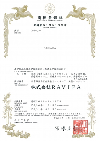 株式会社RAVIPA(代表取締役:新井亨)のアスハダ「ASHADA」の商標が特許庁に登録されました。