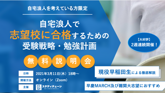 オンライン受験コーチング「スタディチェーン」では、新型コロナによる外出自粛の影響を低減し、首都圏以外の受験生の情報格差を解消するため、及び難関大志望の受験生を対象に「自宅浪人で志望校に合格するための受験戦略、勉強計画のオンライン説明会」を2021年3月11日(木)18時~より配信します。