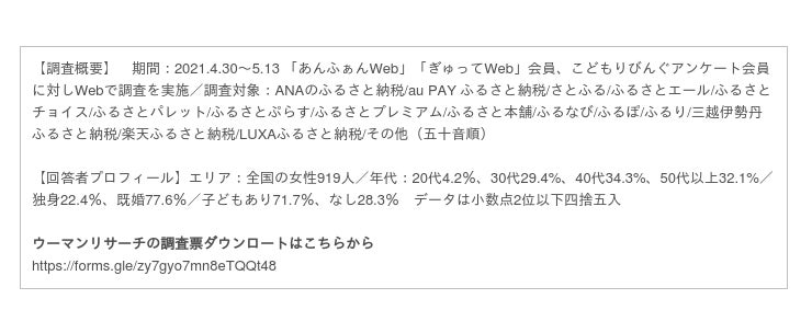 園児とママの情報誌「あんふぁん」「ぎゅって」を発行する株式会社こどもりびんぐ(所在地:東京都千代田区、代表取締役:中島一弘)は、 「シルミル研究所」としてリサーチ事業を展開しています。「シルミル研究所」では、全国の女性を対象にした調査「ウーマンリサーチ」を実施し、 女性が選ぶおすすめの商品やサービスをランキング形式で、Webコンテンツとして発信しています。今回は2021年4月~5月に実施した「ふるさと納税サイトについての調査」の結果を発表いたします。