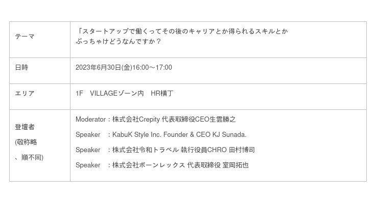 どのチケットをお持ちの方でも入れるVILLAGEゾーンのなかでも、多くのHR関連企業が集結する注目のエリアである「HR横丁」にて、当社代表取締役 室岡拓也がパネルディスカッションに登壇いたします。
