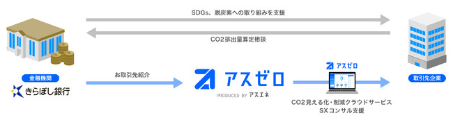 CO2排出量見える化・削減クラウドサービス「アスゼロ」を提供するアスエネ株式会社(本社:東京都港区、代表取締役CEO:西和田 浩平、以下「当社」)は、株式会社きらぼし銀行(本社:東京都港区、取締役頭取:渡邊 壽信、以下「きらぼし銀行」)とビジネスマッチング契約を締結しました。アスゼロの脱炭素ワンストップソリューションを通じて、首都圏エリアにある企業の脱炭素経営を支援します。