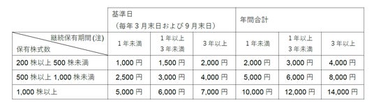 (注)継続保有期間は、「基準日(毎年3月末日および毎年9月末日)において、同一の株主番号