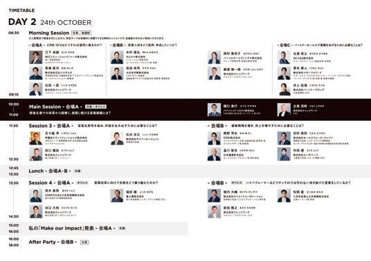 新しい時代に求められる営業「NEW SALES」を各業界で推進する約30名が登壇し、ディスカッションやディナーセッション、アフターパーティーなど、業界を越えた活発な意見交換と対話が生まれました。