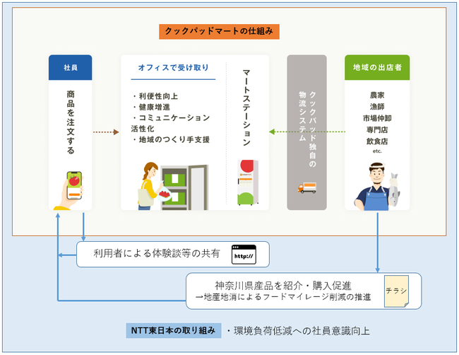 環境負荷軽減の取り組みの一環として、社員による「クックパッドマート」を通じた神奈川県産品の購入を促進することで地域の生産者に貢献するともに、地産地消<*1>およびフードマイレージ<*2>の削減等への社員意識を高め、NTTグループの新しい環境エネルギービジョン「NTT Green Innovation toward 2040」<*3>の実現につなげていきます。