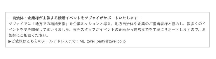 本パーティーは、人口減少や少子高齢化、町民の未婚化・晩婚化に危機感を持つ上郡町が「出会いの機会創出」を目的に主催し、自治体の婚活支援や各種婚活イベント開催のノウハウを持つツヴァイが受託開催するものです。ツヴァイでは、社会問題の解決と地方創生ビジョンの実現に向け、店舗ネットワーク・長年のノウハウを活用し、今後も自治体の婚活支援を積極的に推進してまいります。