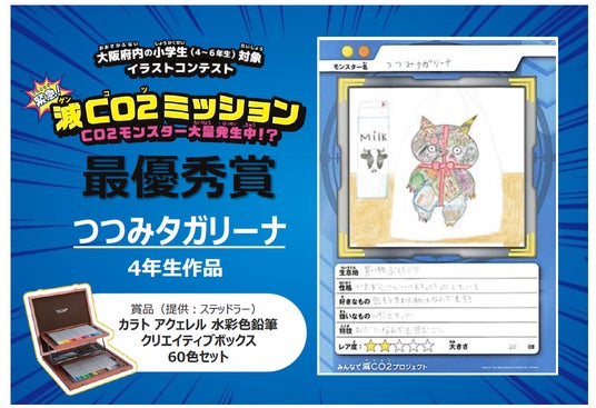 本コンテストは、2024年7月19日から8月25日まで、大阪府内小学校等1,029校の4~6年生(支援学校小学部を含む)約21万人を対象に、暮らしの中のムダ行動で排出してしまうCO2をモンスターに見立てた「CO2モンスター」イラストを募集したものです。この度、応募総数1,437件(うち審査対象1,417件)の中から最優秀賞1件と優秀賞100件の受賞作品が決定し、小学校4年生の児童が考案した過剰包装のCO2モンスター「つつみタガリーナ」が最優秀賞に選ばれました。