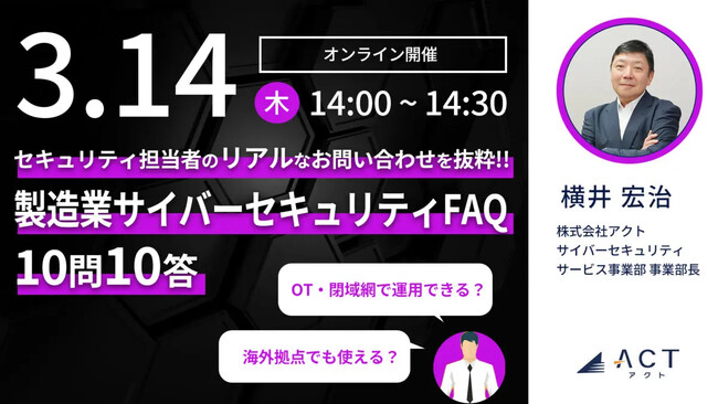 今年30周年を迎え、サイバーセキュリティ事業などを行う株式会社アクト(本社:東京都文京区、代表取締役CEO 小林 智彦 、以下 アクト)は3/14(木)、セキュリティ担当者の「リアルな」お悩みに答える ~ 製造業サイバーセキュリティFAQ 10問10答 ~のウェビナーを開催します。