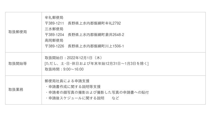 飯綱町では、マイナンバーカードの申請支援を日本郵便株式会社信越支社に業務委託し、令和4年12月1日から町内3郵便局でマイナンバーカードの申請受付を開始します。