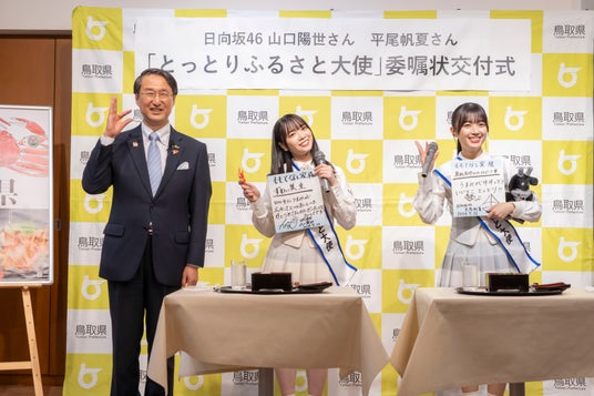 鳥取県は、日向坂46のメンバーで鳥取県出身の山口陽世(やまぐち はるよ)さん、平尾帆夏(ひらお ほのか)さんを「とっとりふるさと大使」に任命しました。併せて、東京 新橋の鳥取県・岡山県の共同アンテナショップ「とっとり・おかやま新橋館」にて、「とっとりふるさと大使」委嘱状交付式を実施いたしました。