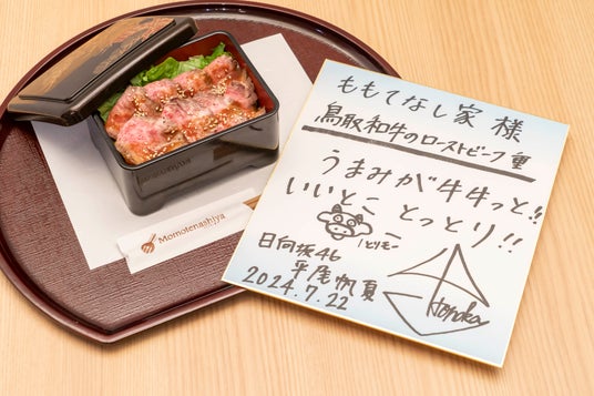 続いて大使の初仕事として「アンテナショップカフェ『ももてなし家』の鳥取メニューを食レポせよ!」というミッションに挑みます。カニの水揚げ量日本一の鳥取県産紅ずわい蟹を、ぜいたくに重箱に盛り込んだ「紅ずわい蟹重」は山口さんが試食。鳥取県の特産品である「鳥取和牛」でご飯を覆いつくした売切御免のももてなし家看板メニュー!「鳥取和牛のローストビーフ重」を平尾さんが試食しました。まず山口さんは「紅ずわい蟹重」を食べて、「口の中に旨味が広がって、たしカニー贅沢な美味しさです!」とレポートしました。続いて「鳥取和牛のローストビーフ重」を口にした平尾さんは「旨味が牛牛(ぎゅぎゅ)っと!いいとことっとりです!」とコメント。おふたりの元気いっぱいの食レポに平井知事も「カニぺき(完璧)です!」「ベリー牛ット(ベリーグット)でした!」と太鼓判を押しました。