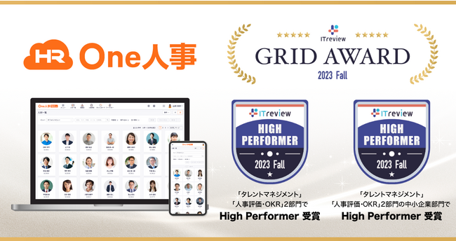 組織の”人”にかかわる業務を一気通貫で支える人材プラットフォームの「One人事」を提供するOne人事株式会社(本社:東京都品川区、代表取締役社長:唐沢雄三郎)は、「ITreview Grid Award 2023 Fall」の「タレントマネジメント」「人事評価・OKR」2部門でHigh Performerを受賞したことをお知らせいたします。