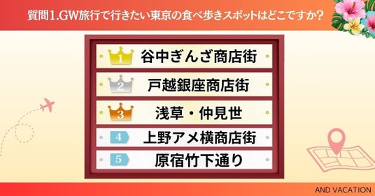 質問1.GW旅行で行きたい東京の食べ歩きスポットはどこですか?