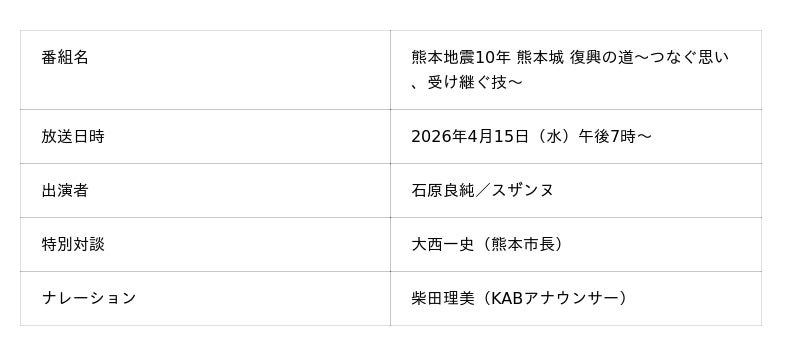 熊本朝日放送株式会社(本社:熊本県熊本市西区、代表取締役社長:⽵内圭介)は、2026年4月15日(水)午後7時から特別番組「熊本地震10年 熊本城 復興の道~つなぐ思い、受け継ぐ技~」を放送します。