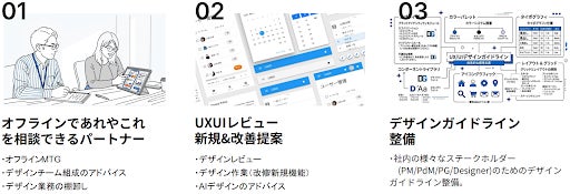 リソース不足でデザインが属人的になる、品質とスピードを両立できない等の課題を持つ顧客に適した伴走支援プログラムです。経験豊かなデザイナーの定期訪問、UX/UIレビューの提案、デザインガイドライン整備を通じて、顧客プロダクトの「デザイン資産化」を促します。