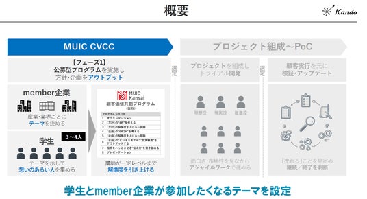 - 全プログラム完走・最終プレゼン実施後、選出された優良なアイデアは、次のステップとして、PoC(実証実験)に向けた更なるアイデア磨き上げフェーズである「Post CVCC」に入る。学生アイデアを元に、MUIC伴走支援のうえ、MUIC Kansai協賛会員企業含む幅広い企業とのPoC機会を模索。