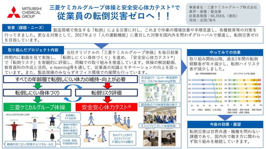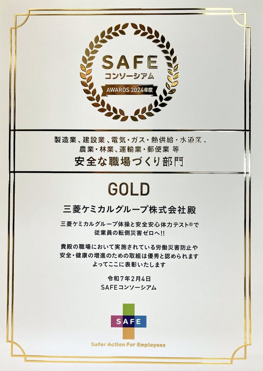 三菱ケミカルグループは、厚生労働省が主催する2024年度第3回「SAFEアワード」において、転倒災害ゼロをめざす「三菱ケミカルグループ体操」と「安全安心体力テスト」の取り組みが、安全な職場づくり部門で最高ランクの「ゴールド賞」を受賞したことをお知らせします。今回、初めての応募での受賞となりました。