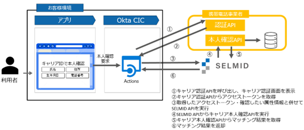 今回、そうした認証における課題を解決し、開発者の負荷を軽減するOkta CICと、SELMIDが備える、携帯電話の契約者情報を利用した本人確認を可能にする「キャリア本人確認」の機能を連携しました。本人確認が必要なアプリケーションの利用時に、携帯電話回線の契約で利用した情報と照合して確実で迅速な本人確認機能を実現します。まずは、株式会社NTTドコモの回線を対象としていますが、順次、対象となる回線を追加予定です。