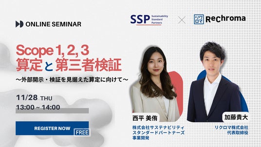 リクロマ株式会社(以下、リクロマ)と株式会社サステナビリティスタンダードパートナーズ(以下、SSP)は、企業が直面する温室効果ガス排出量の算定と第三者検証の重要性について解説する共催セミナーを開催します。