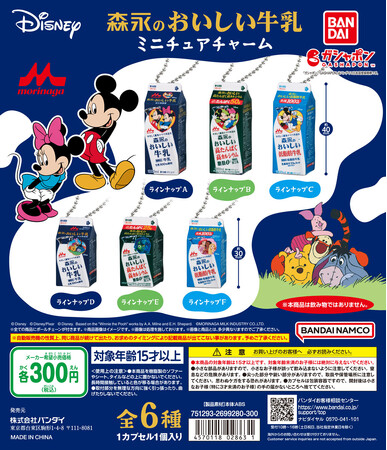 株式会社バンダイ ベンダー事業部(本社:東京都台東区)は、森永乳業株式会社(本社:東京都港区)が製造・販売する「森永のおいしい牛乳シリーズ」のディズニーデザインパッケージをミニチュアチャームにした『Disney 森永のおいしい牛乳 ミニチュアチャーム』(1回300 円・税10%込、全6種)を2023年11月第2週より全国のガシャポンバンダイオフィシャルショップ、玩具売場、量販店、家電店などに設置されたカプセルトイ自販機にて発売いたします。
