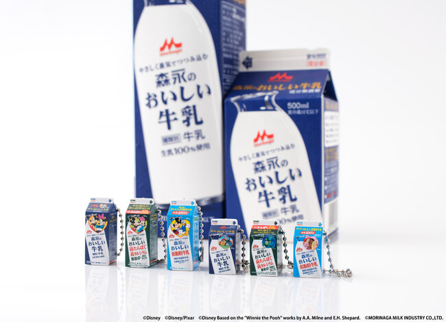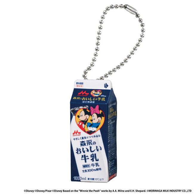 本商品は、森永乳業株式会社が製造・販売する「森永のおいしい牛乳シリーズ」のうち2023年3月6日(月)週より期間限定で展開したディズニーパッケージの商品を全高約30~40mmのミニチュアにしたリアルなチャームです。ラインアップは、1000mlのパッケージ3種と500mlのパッケージ3種の全6種です。