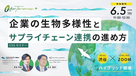 八千代エンジニヤリング株式会社(本店:東京都台東区、代表取締役社長執行役員:高橋 努)は、株式会社パルコデジタルマーケティング(本部:東京都渋谷区、代表取締役社長:岡田 泰宏)と共催で、「企業の生物多様性とサプライチェーン連携の進め方」と題したセミナーを6月5日(木)に開催いたします。