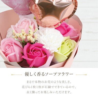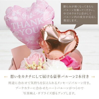 本商品は、花びら一枚一枚が石けん素材でできたソープフラワーを使用した花束に、ハートバルーンとメッセージバルーンを添えた華やかなギフトブーケ。花瓶がなくてもそのまま飾れる自立式のスタンディングタイプで、誕生日や送別、母の日など、さまざまなギフトシーンで活躍するフラワーギフトです。
